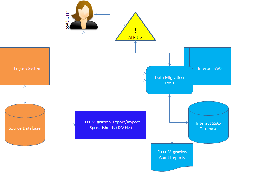 Various Audit Reports are available to the User to verify that the Data Migrated is complete, accurate, and valid before it is committed to the Interact SSAS Database. During the Data Migration process extensive use of Alert Messages informs the user of Data Issues as well as the progress of the Data Migration progress. See Diagram below: