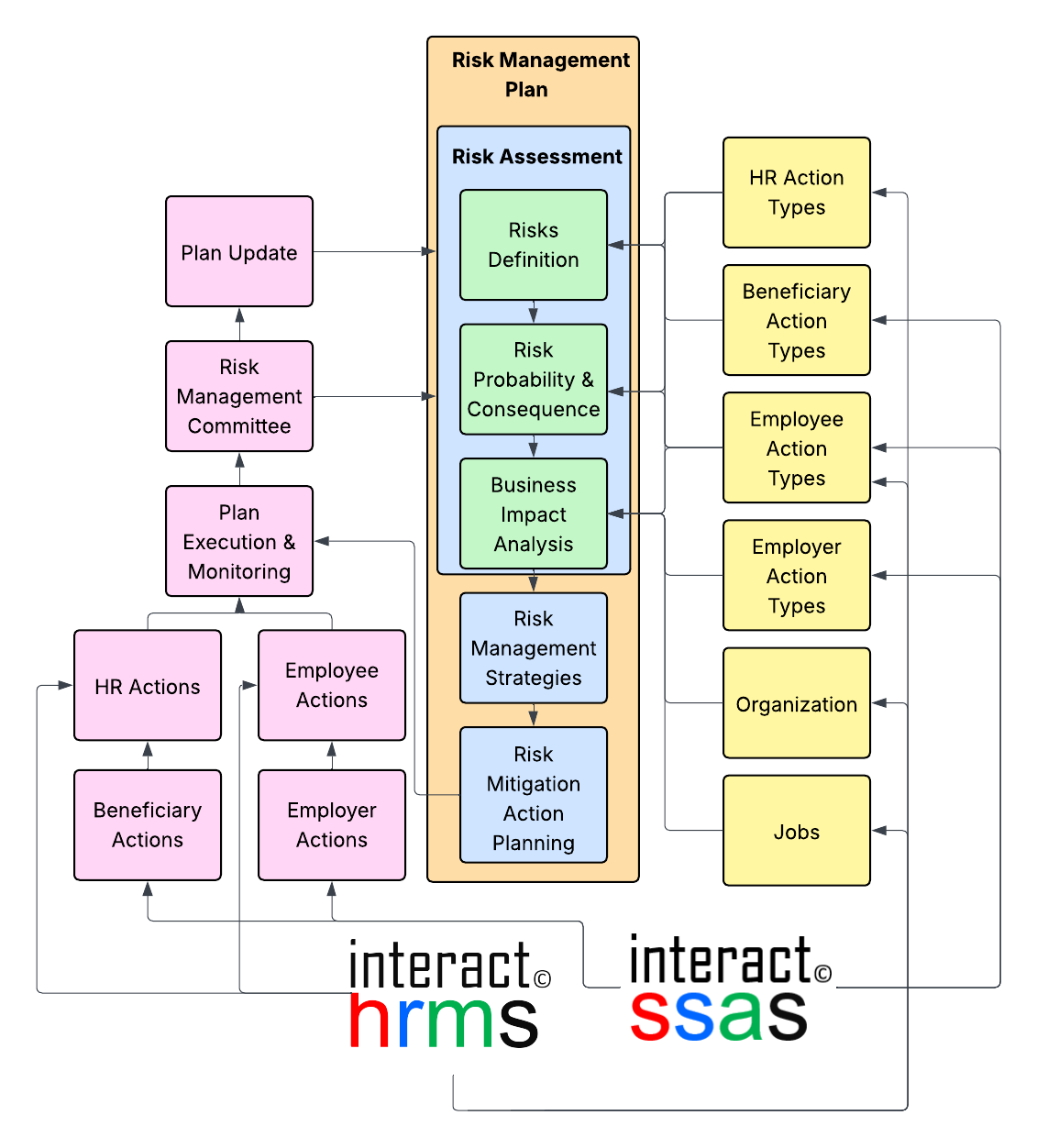 - Integration Capabilities: Seamlessly connects with Interact SSAS for SSA budgeting, contributions management, and crisis response; supports policy alignment where risks trigger updates, and acknowledgments feed back into risk reduction. Direct Interact HRMS integration ensures that individuals assigned tasks in risk management, can view their assigned responsibilities and have their performance tracked in performance management, while supervisors can also monitor progress.