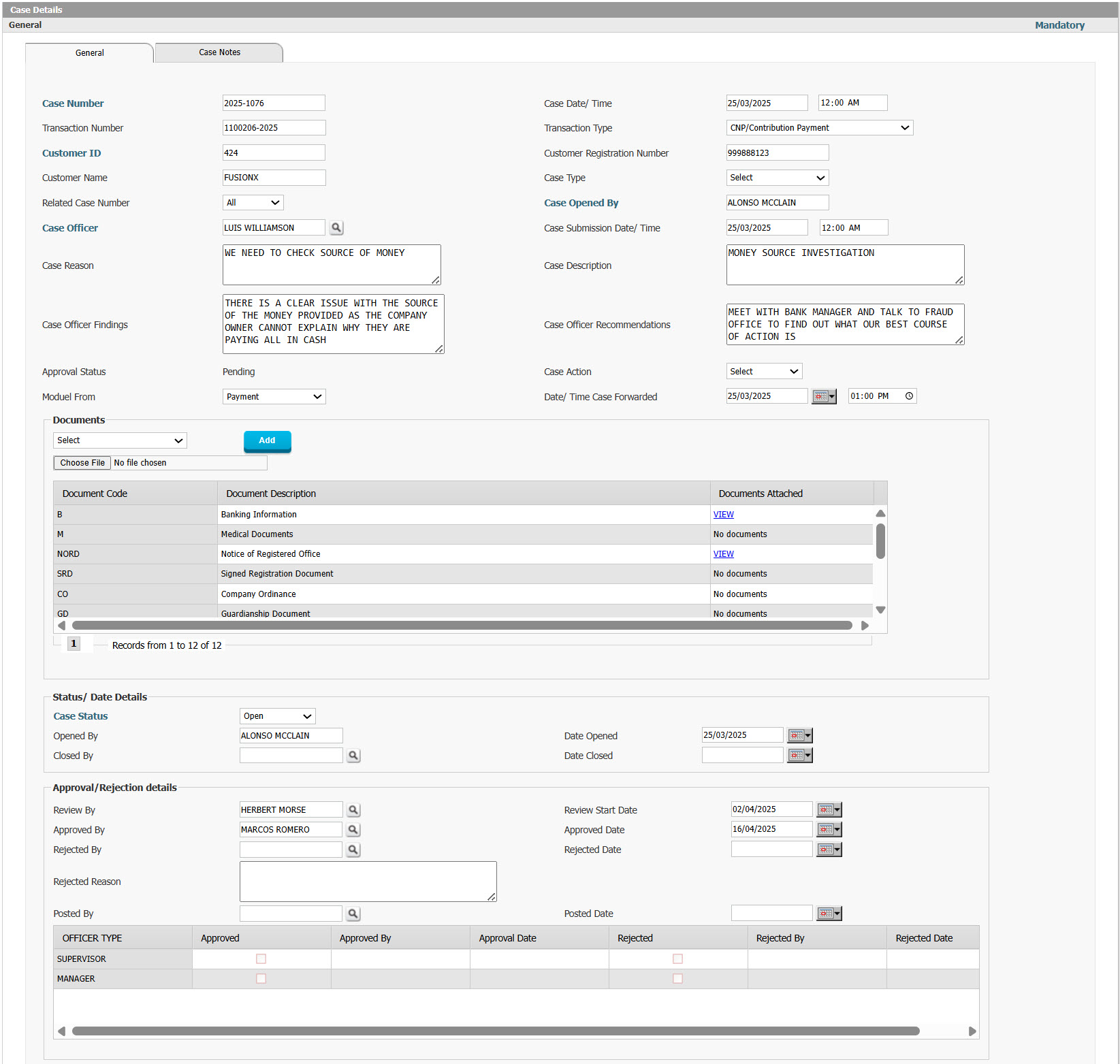 - Cases can be approved, rejected, or closed based on investigation outcomes.